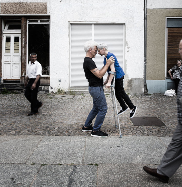 Wie sehen wir einander an? Wie erlauben wir uns gesehen zu werden? Wie bestimmen unsere Körper die Art, wie wir die Welt um uns herum wahrnehmen? Können wir lernen über Grenzen der Andersartigkeit hinwegzusehen? "The Way You Look (At Me) Tonight" ist eine soziale Skulptur – eine sinnliche Reise für zwei Performer und Publikum. Tanzend, singend, Geschichten erzählend und Fragen stellend verbinden der internationale Choreograf und Performer Jess Curtis und die anerkannte schottische Künstlerin Claire Cunningham Performance, Musik und Videokunst um mit wichtigen Fragestellungen über unsere Gewohnheiten und Bräuche die Welt und einander wahrzunehmen, (manchmal wortwörtlich) zu ringen. In Zusammenarbeit mit dem renommierten Autor und Wahrnehmungsphilosophen Alva Noë, Videokünstler Yoann Trellu, Komponist Matthias Herrmann und Dramaturg Luke Pell zeigen sie eine fortgeschrittene Recherche für ein abendfüllendes Duett, das auf ihre eigene Weise einander zu sehen rückschließt – als Mann und Frau unterschiedlichen Alters, unterschiedlicher Körperhaftigkeit und Herkunft. 2005 war Jess Curtis der Choreograf, der Cunningham zur Bewegungskunst einlud und ihr den Weg in die Karriere als eigenständige Choreografin ebnete. Ein Jahrzehnt später arbeiten sie wieder zusammen in der Kollaboration "The Way You Look (at me) Tonight".