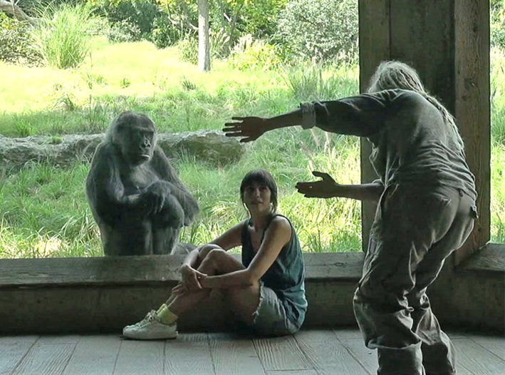 Ausgangspunkt dieser Arbeit ist ein Besuch am SenseLab (Montréal) und eine Recherche im Zoo von Louisville mit der Primatologin Dawn Prince-Hughes zur Kommunikation zwischen Menschen und Gorillas. Auf der Grundlage ihrer Fieldrecordings und der gesammelten Erfahrungen erproben Miriam Jakob und Felix Classen eine neue choreografische Versuchsanordnung. Der Mythos des mimetischen Nachahmens, das Wechselspiel von Differenz und Ununterscheidbarkeit sowie die gemeinsame Nutzung von Technik werden dabei sensorisch erfahrbar gemacht.